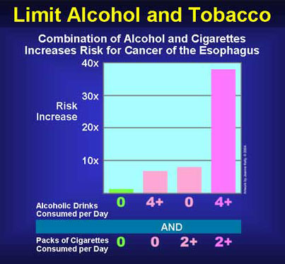Drinking excessive amounts of alcohol increases the risk of cancers of the mouth, esophagus, pharynx, larynx, throat and liver in men and women, and of breast cancer in women.