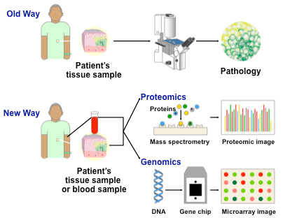 Before the use of molecular diagnostics, doctors primarily classified cancer cells primarily according to their appearance under a microscope (pathology). Molecular diagnostics assesses the interactions of genes (genomics) and proteins (proteomics), identifying gene and protein activity patterns in cancerous cells. Using technology such as mass spectrometry and gene chips, molecular diagnostics is able to identify genes active in cancer, separating them from the others in cells.