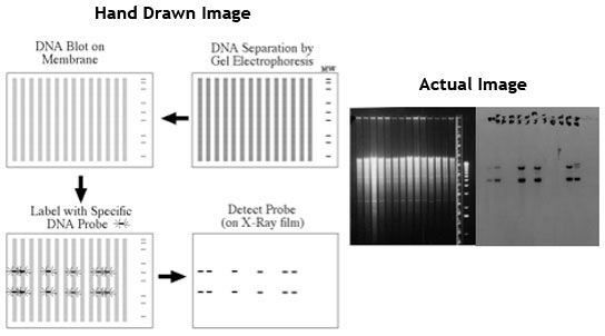 After gel electrophoresis, the material is transferred to a membrane (blot). The material is then labeled with radio-active probes that bind specifically to the pieces of the nucleic acid that are of interest. Finally, the material marked by radio-active probes is detected by exposure to an x-ray.