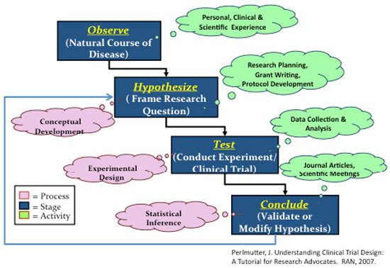 To start with, researchers draw up an idea, or hypothesis, based on available evidence and observations, such as the results of previous experiments. Then the scientists carry out carefully designed studies, or experiments, to test their hypothesis. They collect and record detailed information and measurements, and analyze the data to see if it supports their idea or not. (see schematic below)