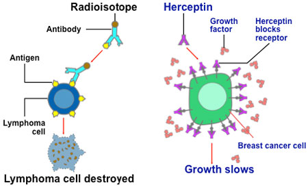Targeted immunotherapy drugs are essentially a collection of monoclonal antibodies that have different cellular targets. Targeted therapies provide specific antigens for specific types of cancer in order to generate an immune response. Cancer cells have substances on their outer surfaces that can act as antigens and mark the cells as abnormal.